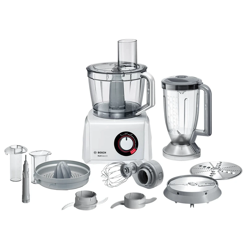 غذاساز ۵۰ کاره سری Multi Talent ۸ (بالاترین سری غذاسازهای شرکت بوش) مجهز به جدیدترین تکنولوژی ساخت تیغه شرکت بوش ( cut blade ) برای خرد کردن ایده آل و بی نقص مجهز به سنسور تشخیص سرعت برای ابزارهای مختلف ( Smart Tool Detection ) بیشترین ظرفیت کاسه بین غذاساز های بوش ( XXL Bowl ) قسمت های پلاستیکی (در تماس با مواد غذایی) فاقد BPA میباشند موتور قدرتمند ۱۱۰۰ واتی هوشمند پالسی کاسه XXL با ظرفیت ۳.۹ لیتر برای خمیر با وزن بیش از ۱.۵ کیلوگرم دیسک های رنده دو طرفه (رنده ریز، درشت و ورقه ای نازک و ضخیم) دارای خمیر زن و همزن دارای آب مرکبات گیر سیستم ایمنی چند گانه ساخت اسلونی با کیفیت بالا