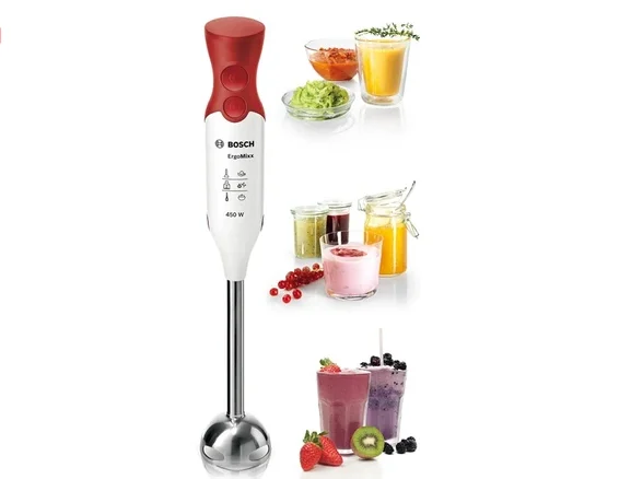 طراحی و تولید گوشتکوب برقی یکی از نوآوریهای نسبتا جدید در عرصه لوازم خانگی برقی است. یک موتور کوچک با سری قابل جداشدن، امکان خرد و مخلوط کردن نواع موادغذایی را با سرعت بیشتری بدون نیاز به انتقال موادغذایی به ظرف دستگاه را ممکن میکند. گوشتکوب برقی «بوش» مدل «MSM64110» یکی از تولیدات باکیفیت و کارآمد این شرکت است. میلهی این گوشتکوب برقی از استیل ضدزنگ ساخته شده است و دارای دو پره تیز و برنده از همین جنس است. طراحی این دستگاه ارگونومیک است و بهراحتی در دست جای میگیرد. این دستگاه یک دکمه برای روشن و خاموش کردن دارد و یک دکمه دیگر نیز برای عملکرد توربو طراحی شده است. در مواجهه با مواد سفت و غلیظ میتوان از عملکرد توربو بهره جست. یک لیوان بزرگ نیز همراه این محصول عرضه میشود و شما میتوانید انواع مخلوط را داخل این لیوان تهیه کنید.