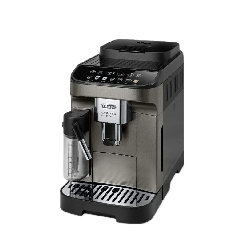 اسپرسوساز اتوماتیک دلونگی مدل Magnifica Evo ECAM 292.81 یکی از محصولات شگفت انگیز برند دلونگی بوده که به صورت کاملا اتوماتیک طراحی شده است. جنس بدنه دستگاه ترکیبی از پلاستیک مرغوب و استیل می باشد که میزان درخشندگی آن بسیار بالا است. همچنین دارای یک پنل لمسی بوده و با کمک 7 دستور برنامه ریزی شده در دستگاه قادر خواهید بود به کمک پودر قهوه و مخزن شیر انواع نوشیدنی های با شیر و بدون شیر را بدون دخالت دست و فقط با لمس یک گزینه تهیه کرده و مزه واقعی قهوه را بچشید. همچنین اسپرسوساز تمام اتوماتیک دلونگی ECAM 292.81 دارای سیستم منحصر به فرد لاته کرما بوده که بافت پر چربی از شیر را برای انواع لاته و کاپوچینو مهیا می کند. توان ورودی دستگاه دلونگی اکثر دستگاه های تمام اتوماتیک به دلیل دارا بودن سه مخزن مجزا آب، شیر و آسیاب قهوه و همچنین تولید فشار بخار آب بالا و مکانیزم ترموبلاک باید دارای توان زیادی باشند. اسپرسوساز 292.81 هم یکی از این موارد بوده که مهندسین برند دلونگی توان 1450 وات را برای آن طراحی کرده اند. این میزان توان باعث به جوش آمدن سریع آب برای تهیه عملیات قهوه و همچنین تولید فشار بخار بالا در سریع ترین زمان ممکن می شود. مخزن مجزا برای آسیاب قهوه بسیار پر اهمیت می باشد. اگر دستگاهی چنین مخزنی داشته باشد کار تولید اسپرسو بسیار راحت تر شده و طعم قهوه به 100 درصد خود نزدیک می شود. اسپرسو ساز دلونگی مدل ایکام 292.81 دارای یک مخزن 250 گرمی کوچک بوده و با کمک سنگ های نوع مخروطی قهوه را در اندازه های کاملا یکسان پودر و خرد می کند. همچنین با تنظیم درجه آسیاب می توانید تا 13 حالت قهوه را پودر نمایید. زیرا هر چقدر قهوه دارای درجه پودر پذیری بیشتری شود، غلظت و مزه آن افزایش یافته و بیشتر مزه قهوه را درک می کنید.